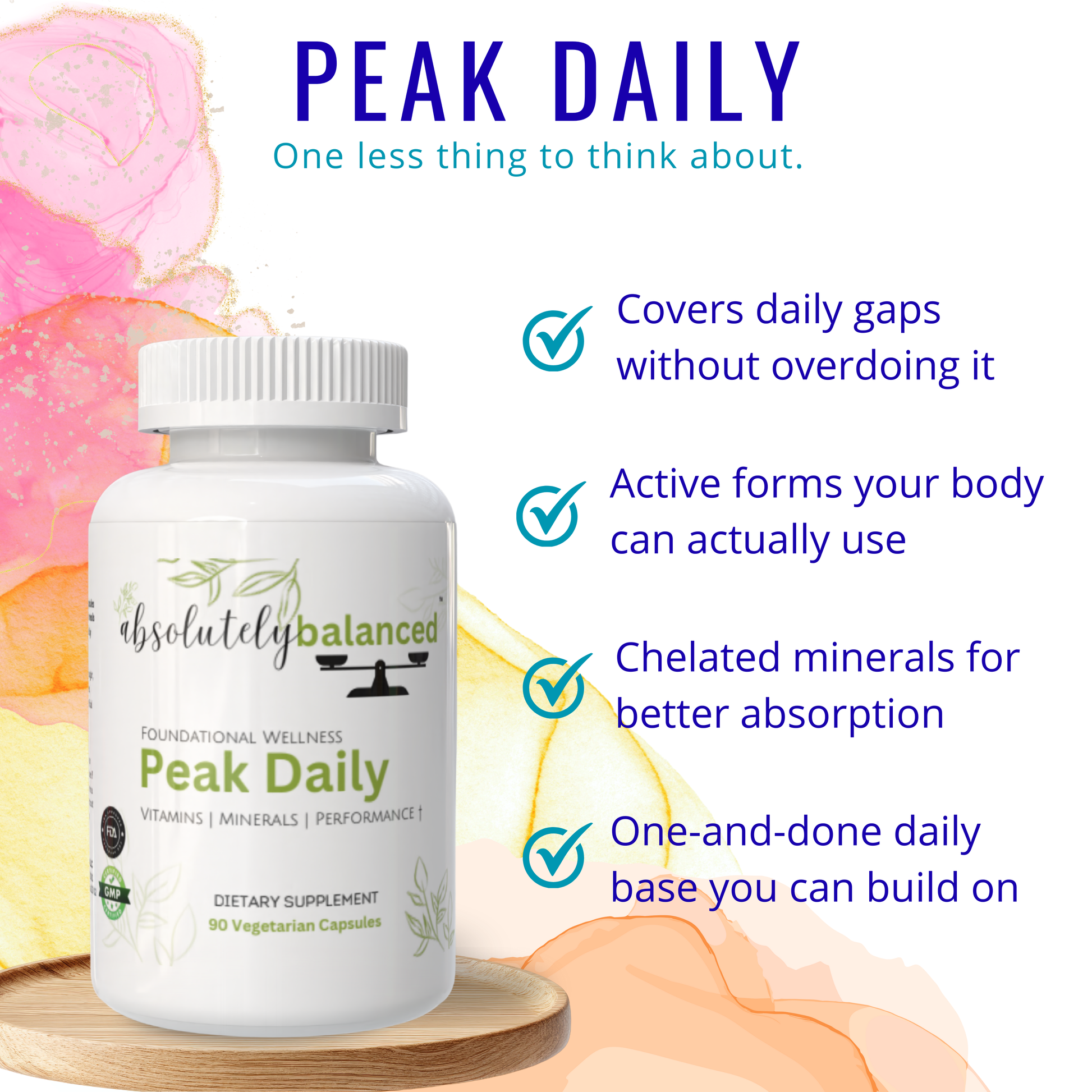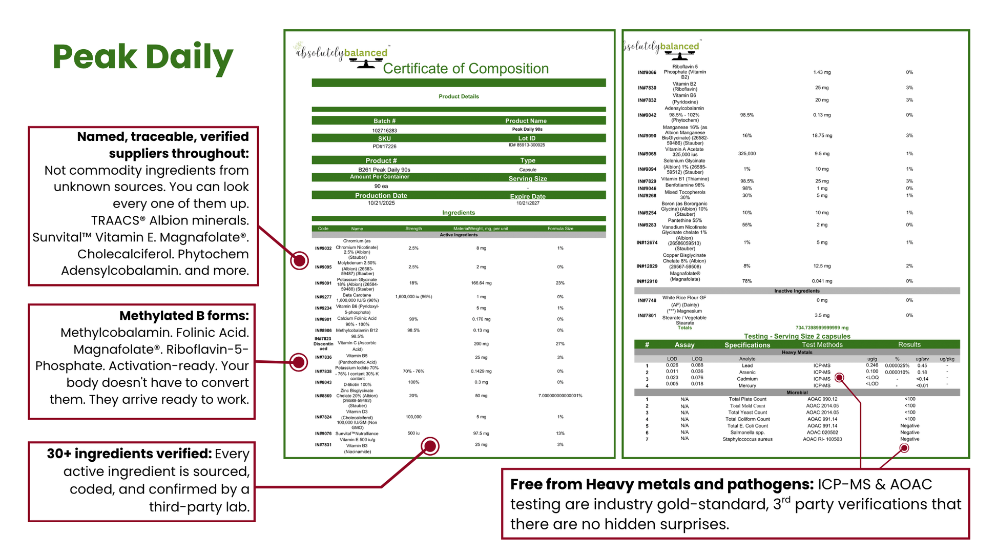 ✔️ Peak Daily. TRAACS® chelated minerals and methylated B vitamins. Forms your body actually uses, not the bargain versions that pass straight through.