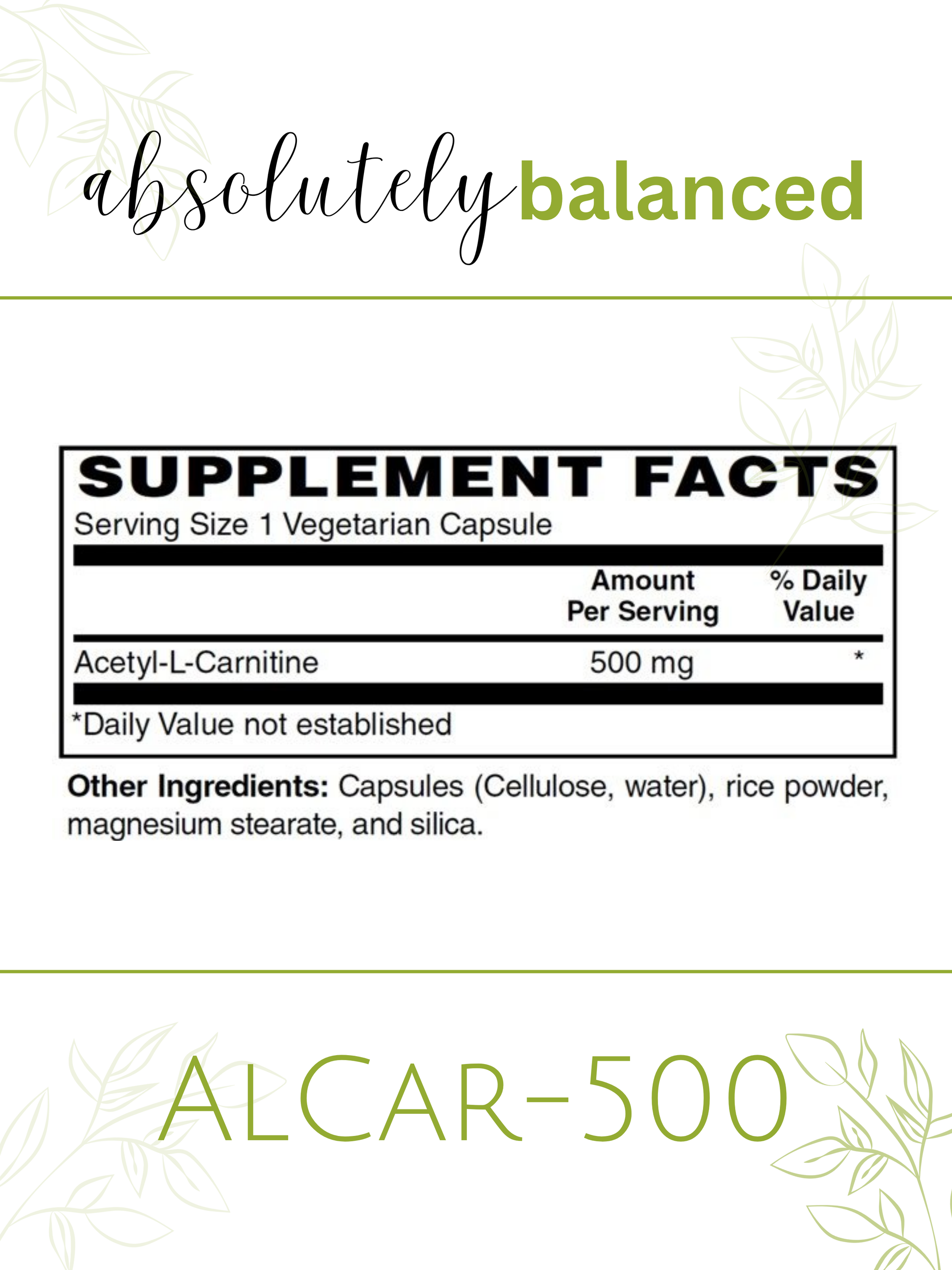 L-Carnitine is an amino acid-like compound that acts as your body's energy transporter. It moves fatty acids into the mitochondria (your cell’s power plants) to be burned for fuel. Acetyl-L-Carnitine (ALCAR) takes it one step further! It is a specialized form of L-Carnitine that absorbs more easily and crosses the blood-brain barrier, making it the best choice for mental sharpness, sustained energy, and cognitive support. Whether you need to stay productive, think faster, or feel more energized, ALCAR-500 has your back.