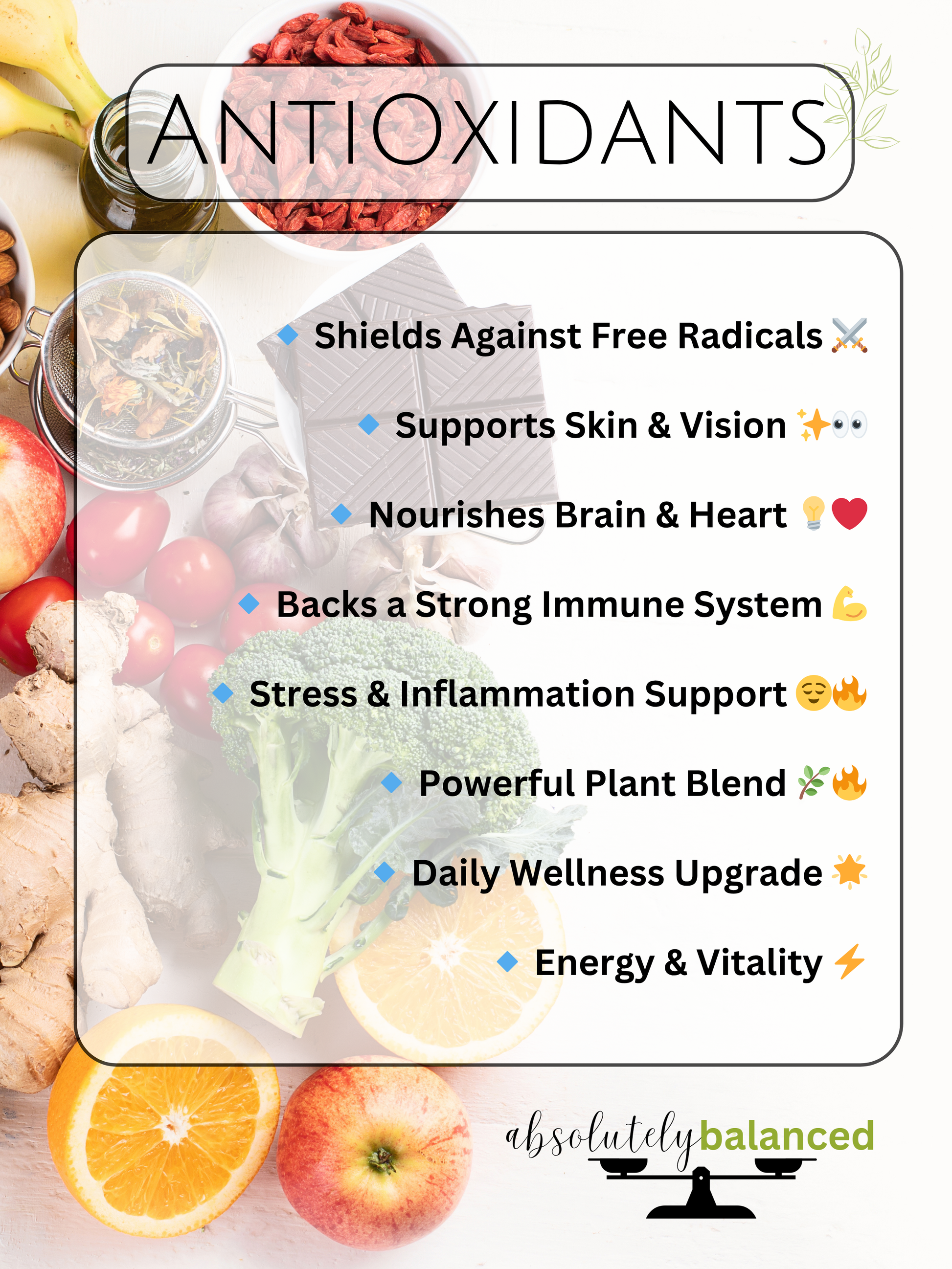 That’s where antioxidants come in. They act like a clean-up crew, helping protect your body from damage, keeping you feeling younger, sharper, and healthier.