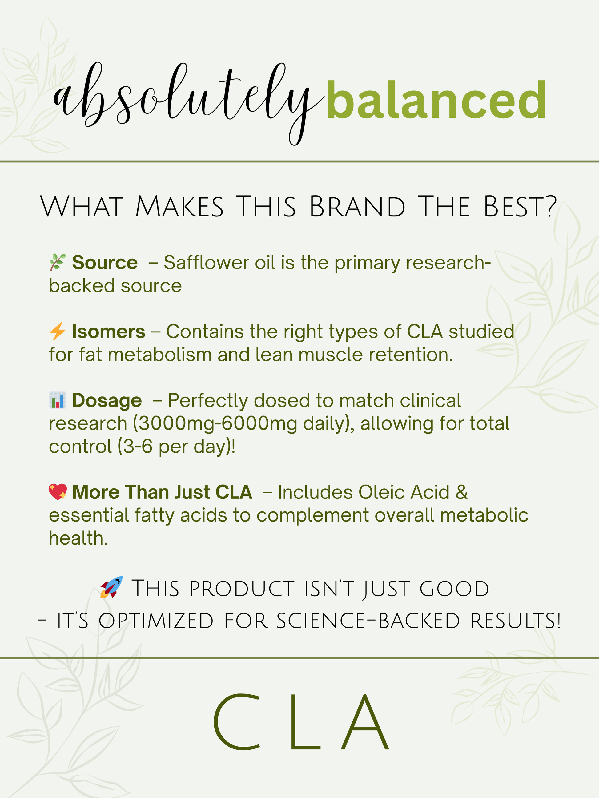 🔬 1,000mg active CLA C18:2 - from Safflower Oil – We source our CLA from high-quality safflower oil, ensuring a potent, research-backed blend of the most effective isomers (that’s just a fancy word for different molecular structures of CLA that help it work).