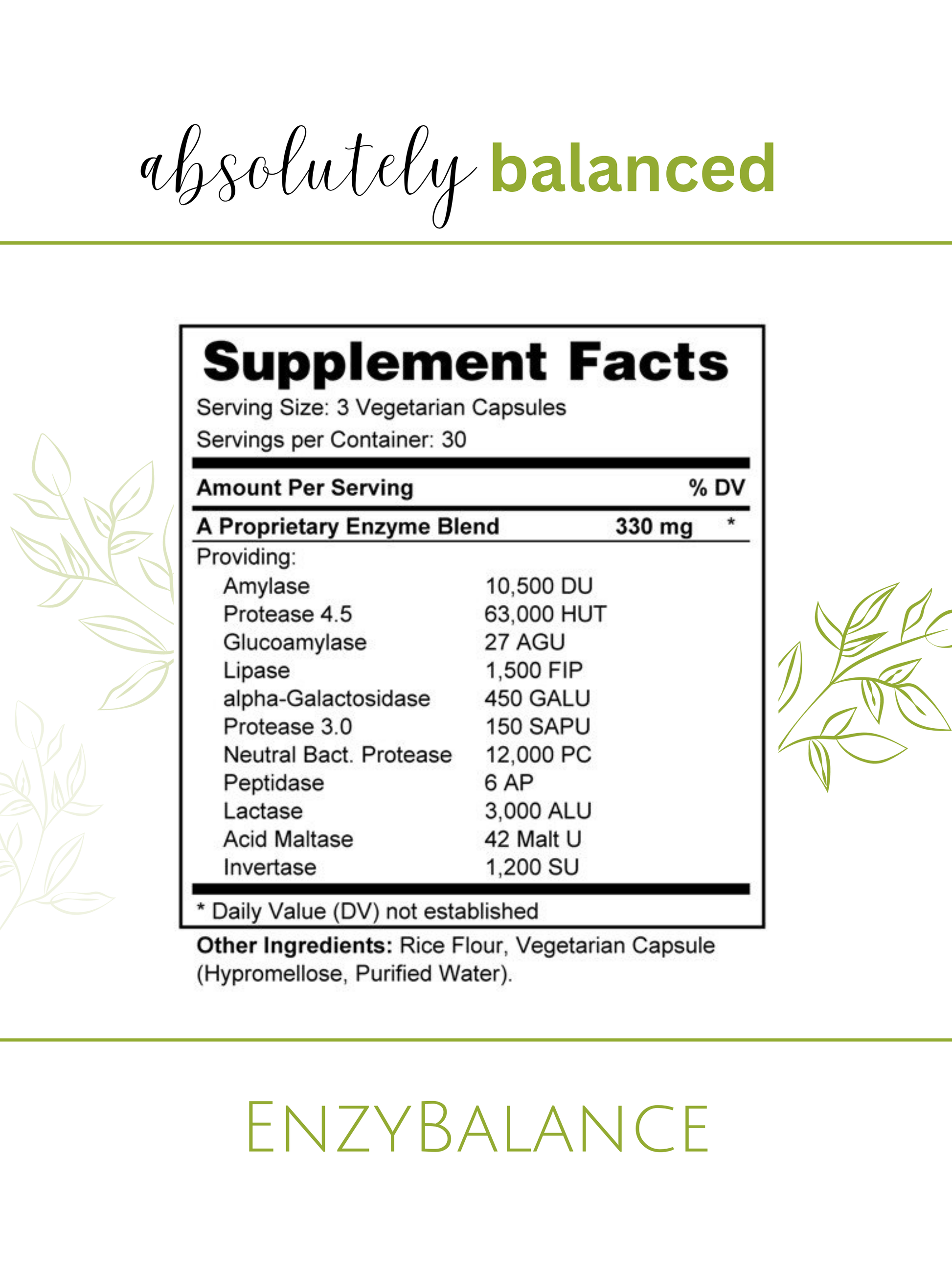 EnzyBalance is your daily digestive wingman. It’s loaded with a full spectrum of plant-based enzymes proven to help your body break down carbs, proteins, fats, lactose, sugars, and fermentable fibers - so you can enjoy your food and actually absorb its benefits. 💥
