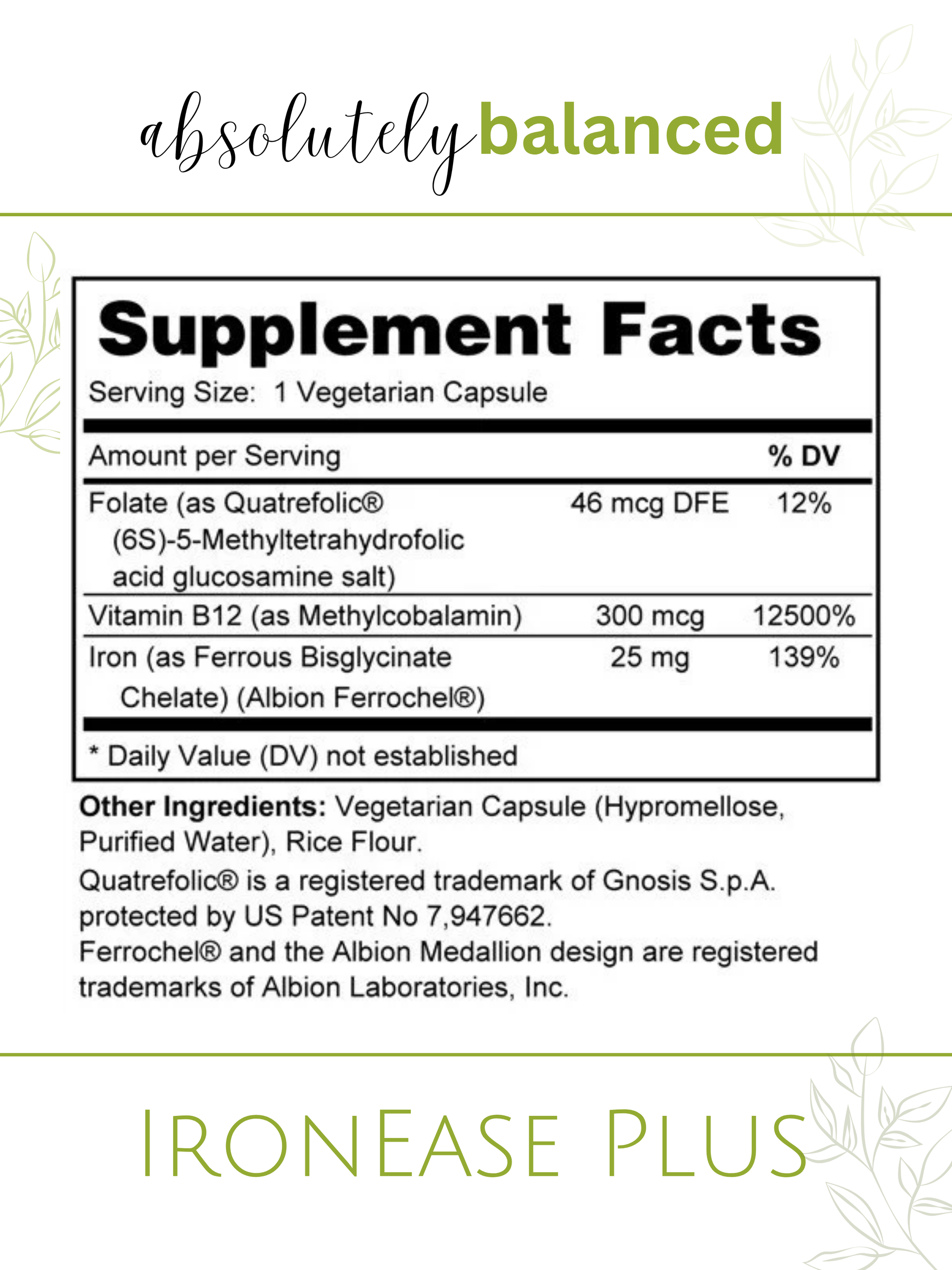 Most multivitamins don’t provide iron in a form your body actually absorbs—and many skip it entirely. Iron Ease Plus steps in with clinically superior forms of iron, folate, and B12 to support what your multivitamin may be missing.
